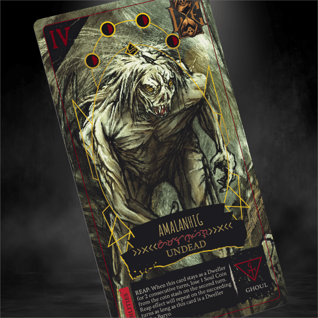 • Amalanhig (Undead): A relentless hunter that uses REAP. If this card stays as a Dweller for consecutive turns, it drains Soul Coins directly from the player’s stash, repeating the effect every turn it remains.
