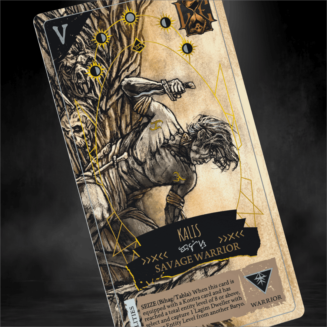 • Kalis (Savage Warrior): A high-level tactician capable of SEIZE. When properly equipped and at high Entity Levels, Kalis can capture Lagim Dwellers directly from an opponent’s Baryo.